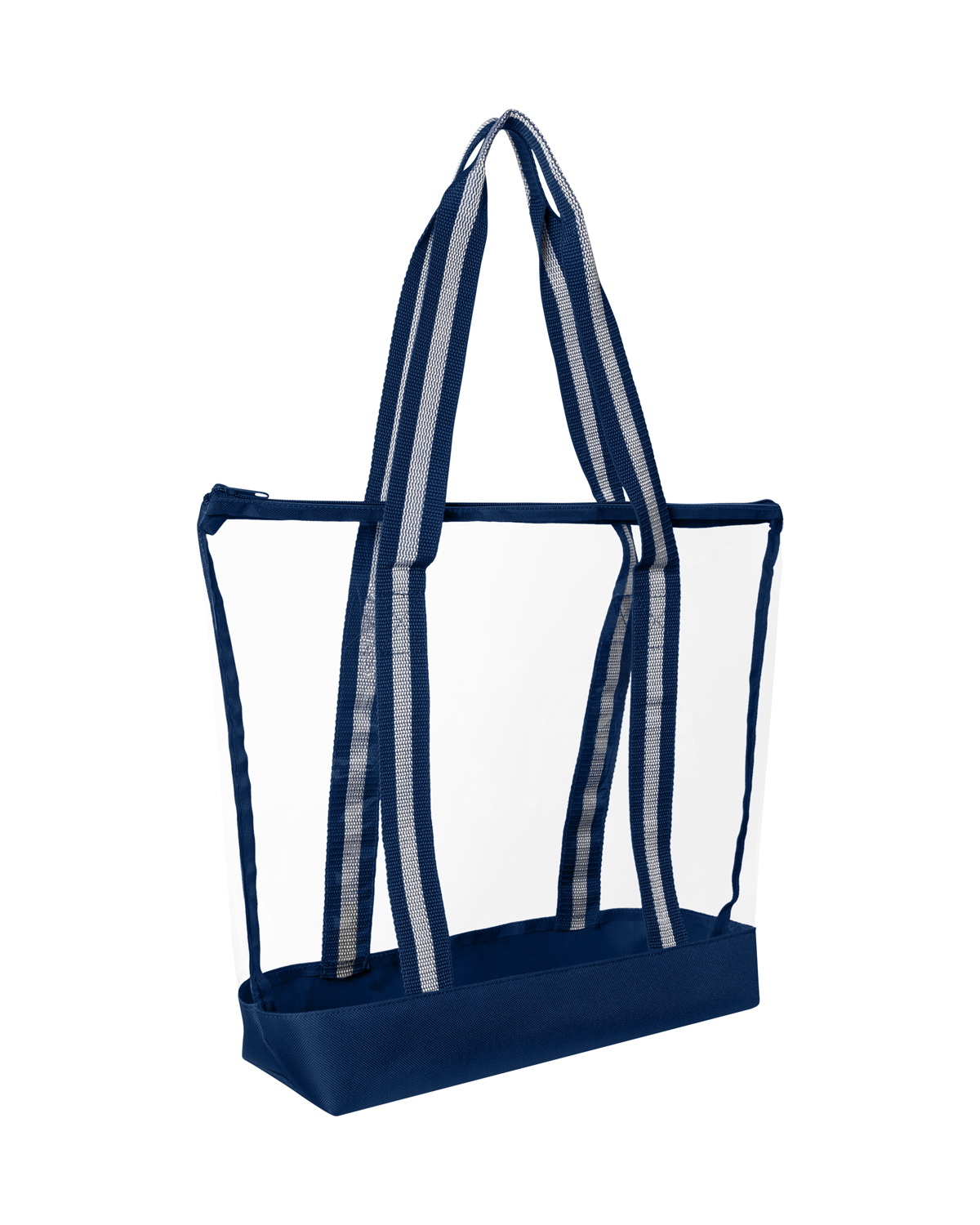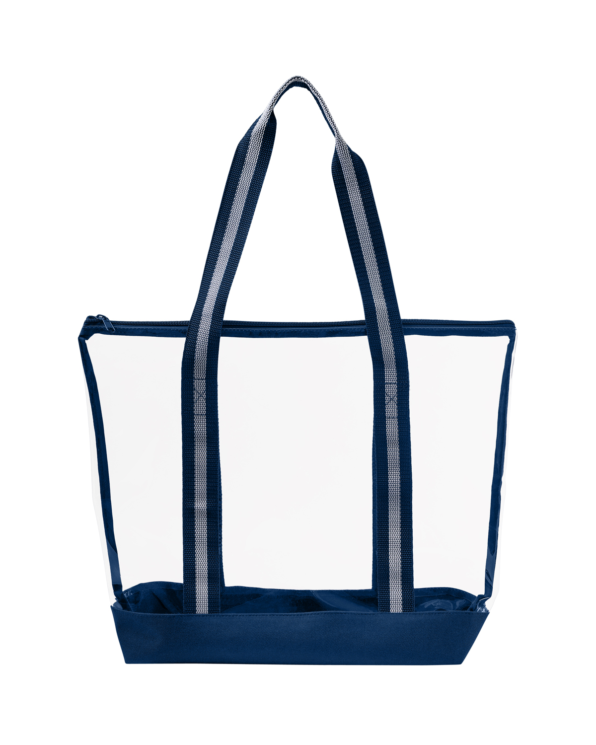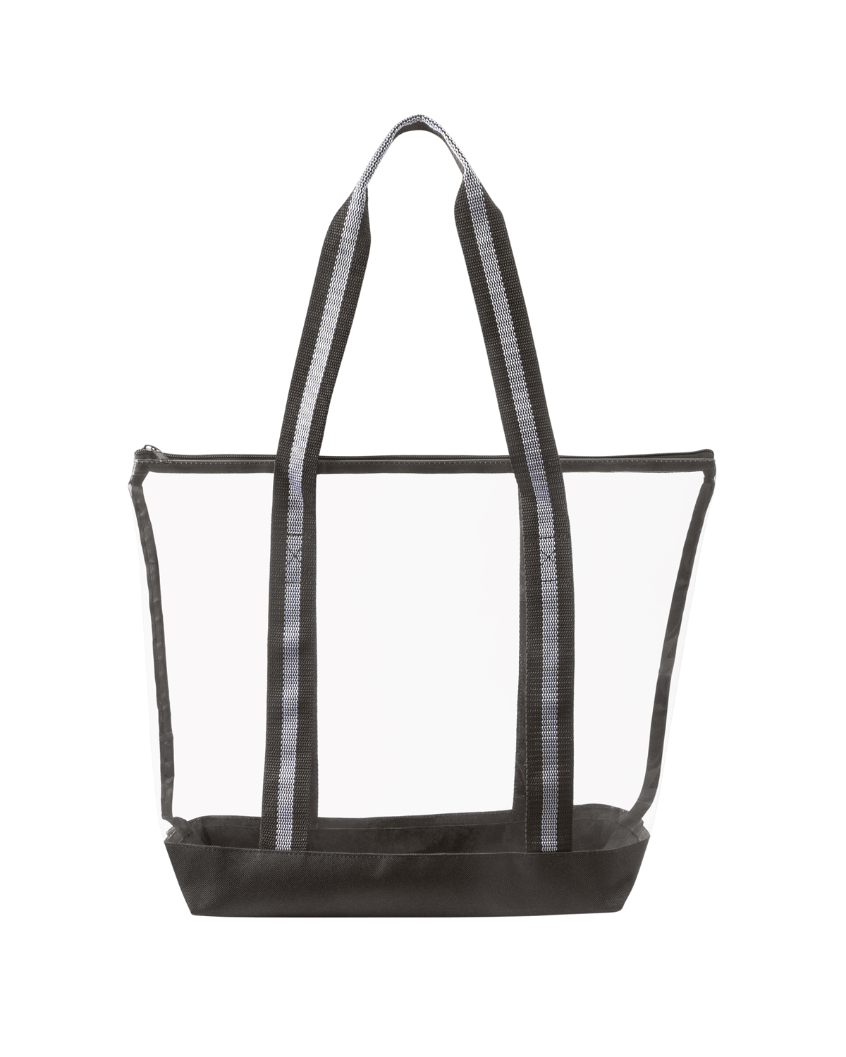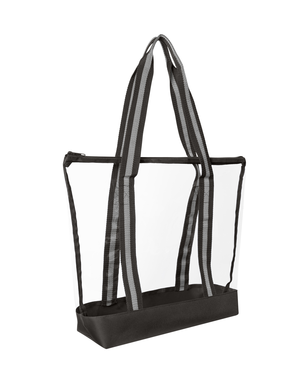 TPU clear tote bag with 600D Polyester base and striped Polyester Web handles. The transparent design makes locating your items simple and seamless. The pliable material bends and expands with your stuff, unlike stiff, crunchy PVC, giving you extra room without the bulk. Zippered closure allows you to keep everything safely tucked inside. Straps measure approx. 46″l x 1.3″w (end to end). Recommended weight tolerance: 17.5 lbs. 13.2000″ W x 14.0000″ H x 4.5000″ D