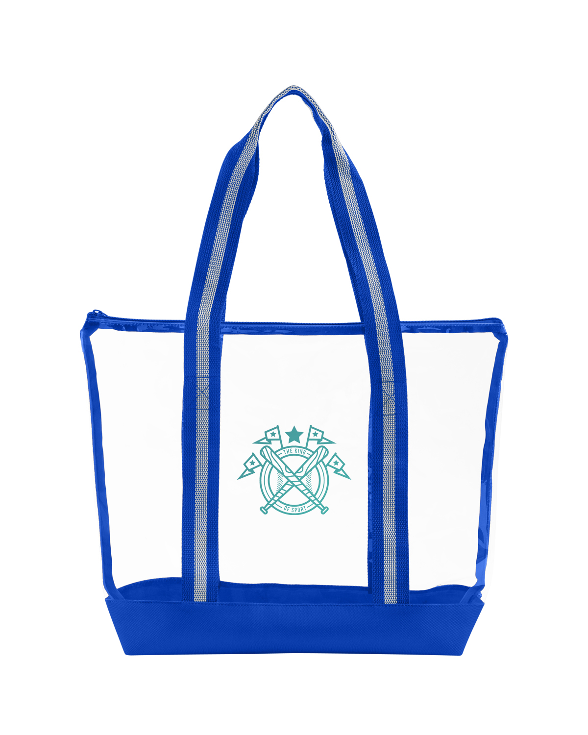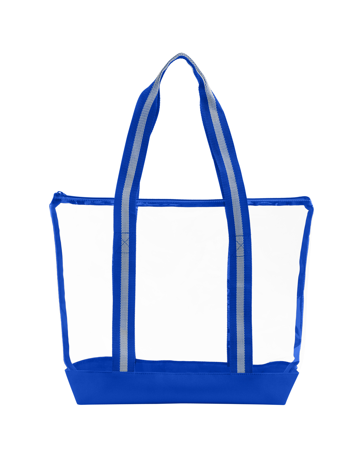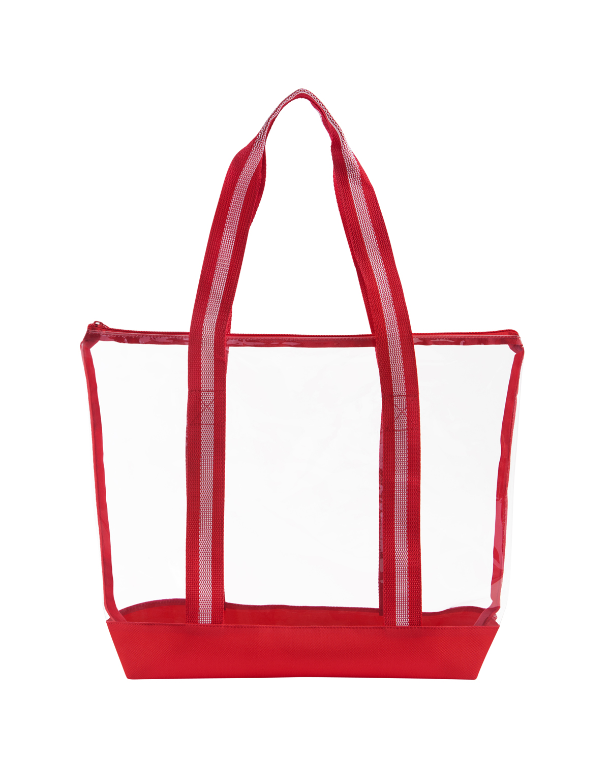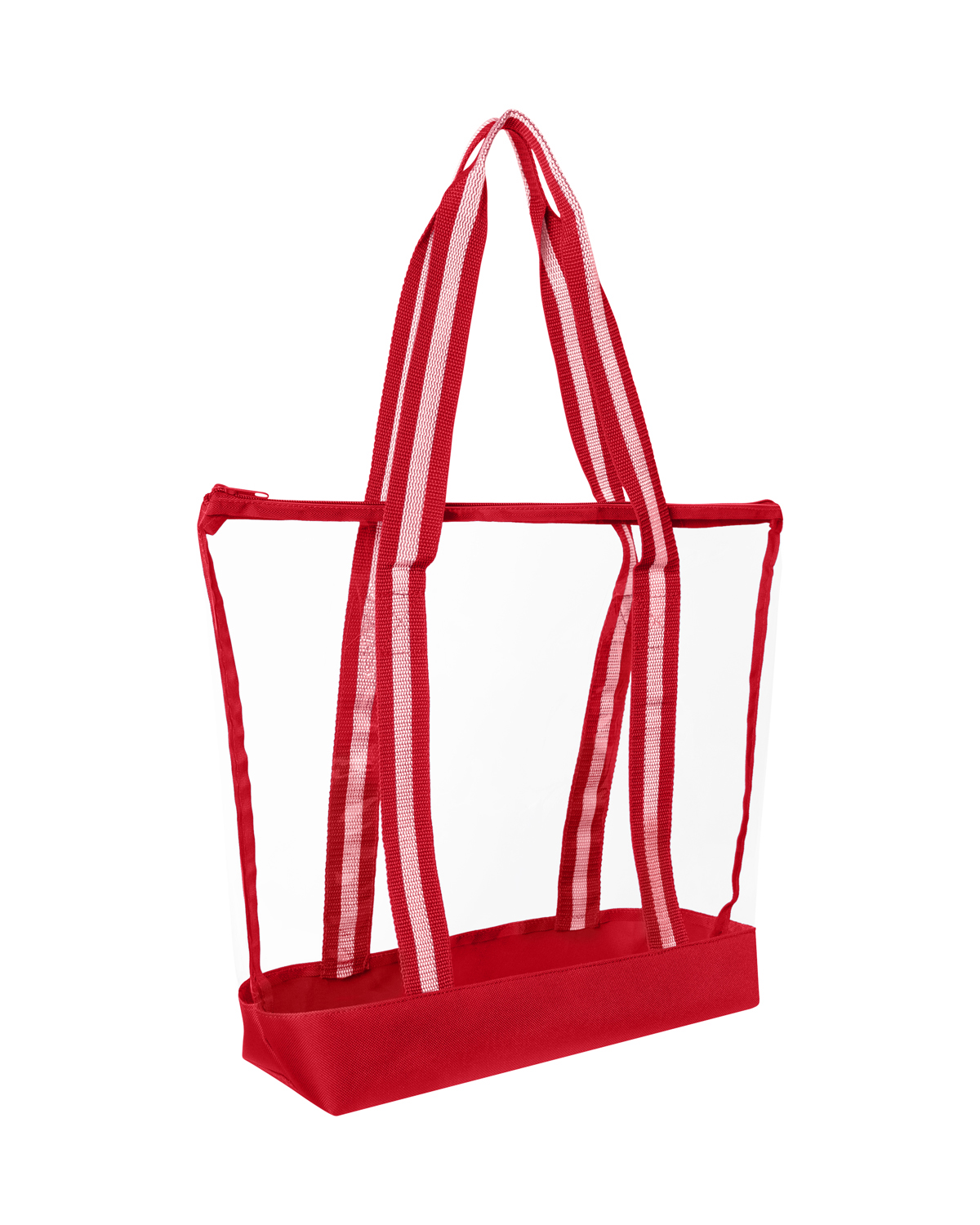 TPU clear tote bag with 600D Polyester base and striped Polyester Web handles. The transparent design makes locating your items simple and seamless. The pliable material bends and expands with your stuff, unlike stiff, crunchy PVC, giving you extra room without the bulk. Zippered closure allows you to keep everything safely tucked inside. Straps measure approx. 46″l x 1.3″w (end to end). Recommended weight tolerance: 17.5 lbs. 13.2000″ W x 14.0000″ H x 4.5000″ D