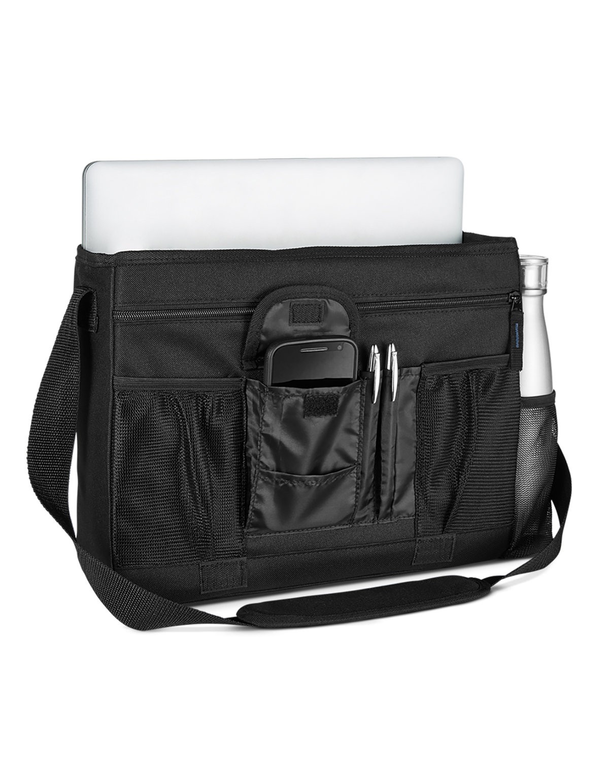 Zipper main compartment with padded laptop sleeve (holds most 15″ laptops). 210D Polyester lining. Zipper pocket on front panel (approx. 11.75″w x 8″h). Rubber earbud port. Organizer pocket under front flap with hook and loop style closure – includes 2 mesh pockets (approx. 4.25″w x 5.75″h each), phone or power bank pocket (approx. 3.875″w x 6″h), business card holder and 3 pen slots (approx. 0.875″w x 5.125″h each). <Side mesh pocket for water bottle (approx. 5.5″w x 6.5″h). Top carry handle and adjustable shoulder strap with padded panel (adjusts from 28″l up to 55″l). To clean wipe with damp cloth</li>Recommended weight tolerance: 22 lbs. 14.9600″ W x 11.2200″ H x 3.5400″ D