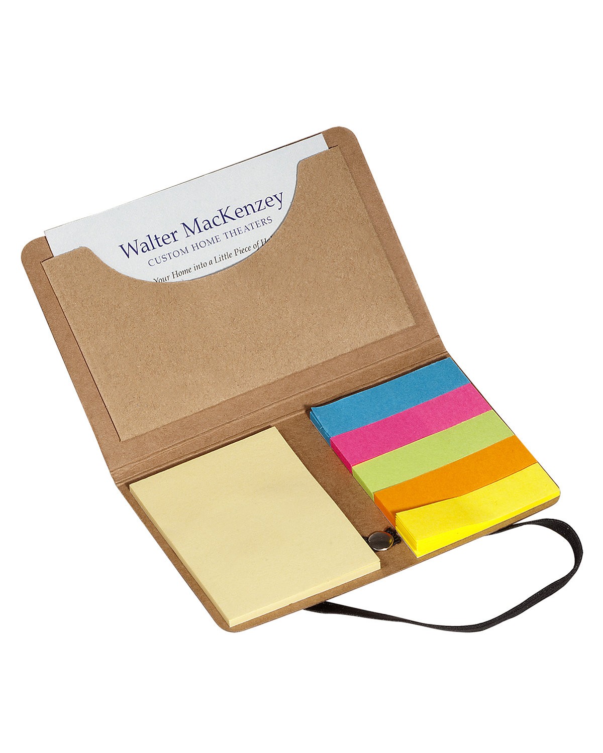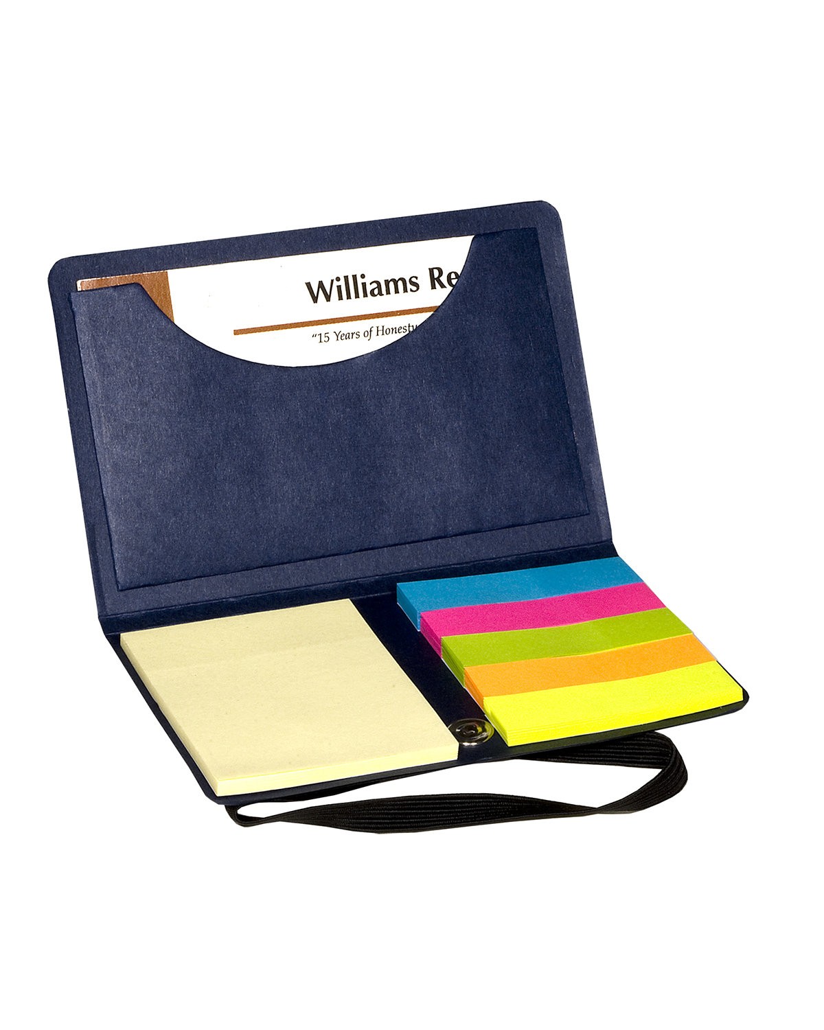 Cardboard card holder with sticky notes and flags. Includes five assorted sticky page markers and a 2.375″w x 1.75″h yellow sticky pad, all 25 sheets each. Features an internal business card pocket and an elastic closure that can hold up to 6 business cards. 2.6250″ W x 4.5000″ H x 0.2500″ D