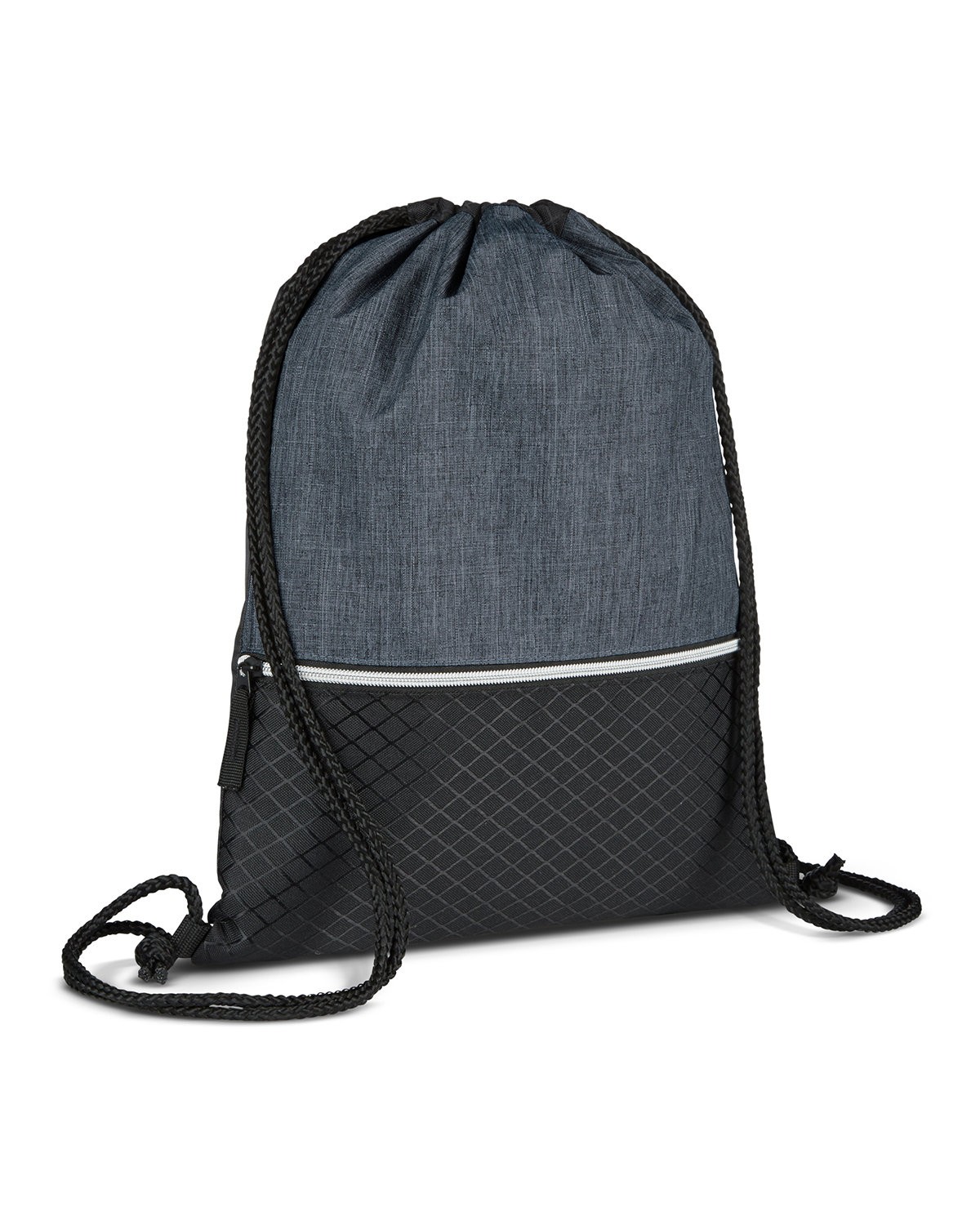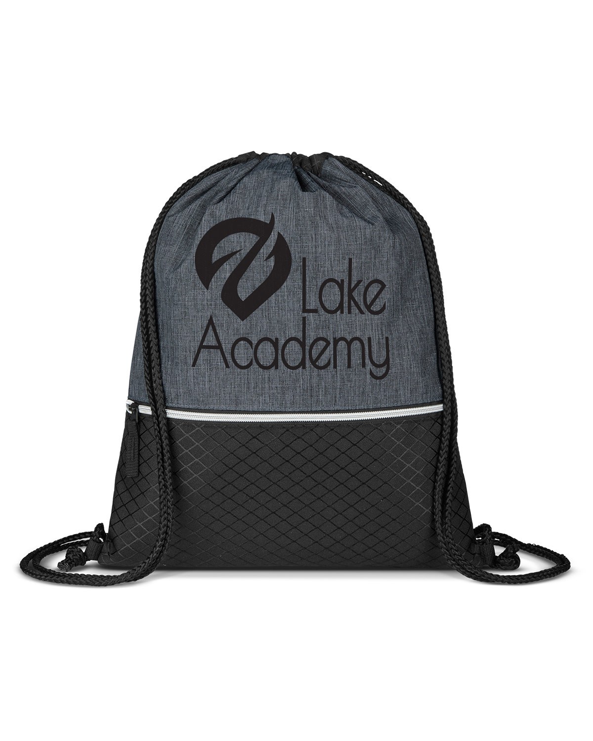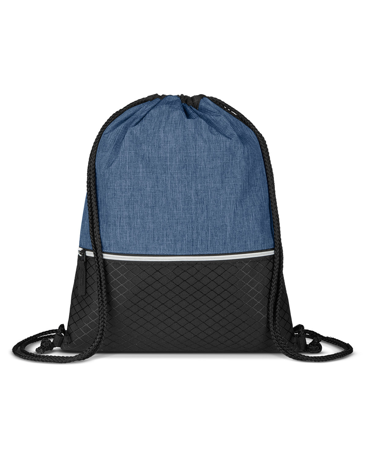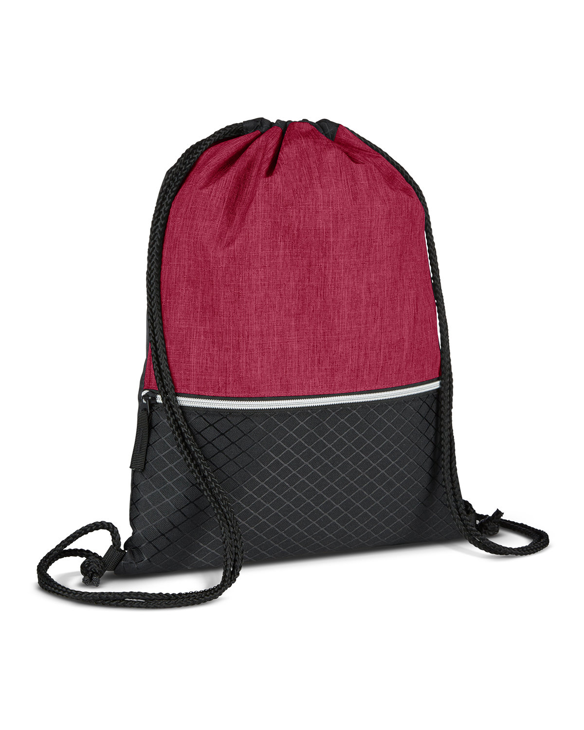 Drawstring bag made of of 300D Polyester with PU backing with 600D Polyester textured front pocket. Solid black 420D Polyester back and 210D Polyester lining. Front zipper pocket measures approx. 13.5″w x 6.5″h. To clean wipe with damp cloth. Recommended weight tolerance: 22 lbs. 13.5000″ W x 17.5000″ H
