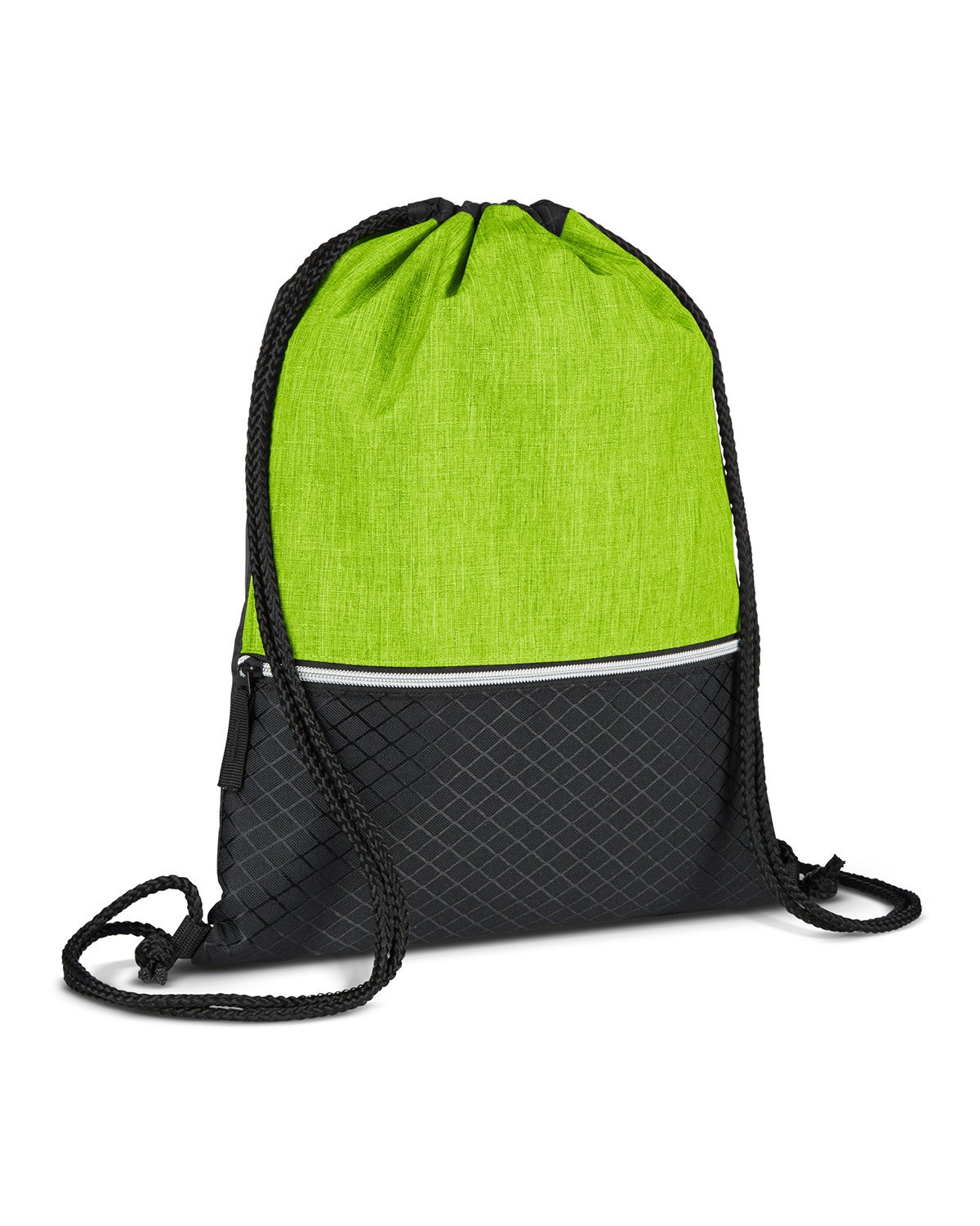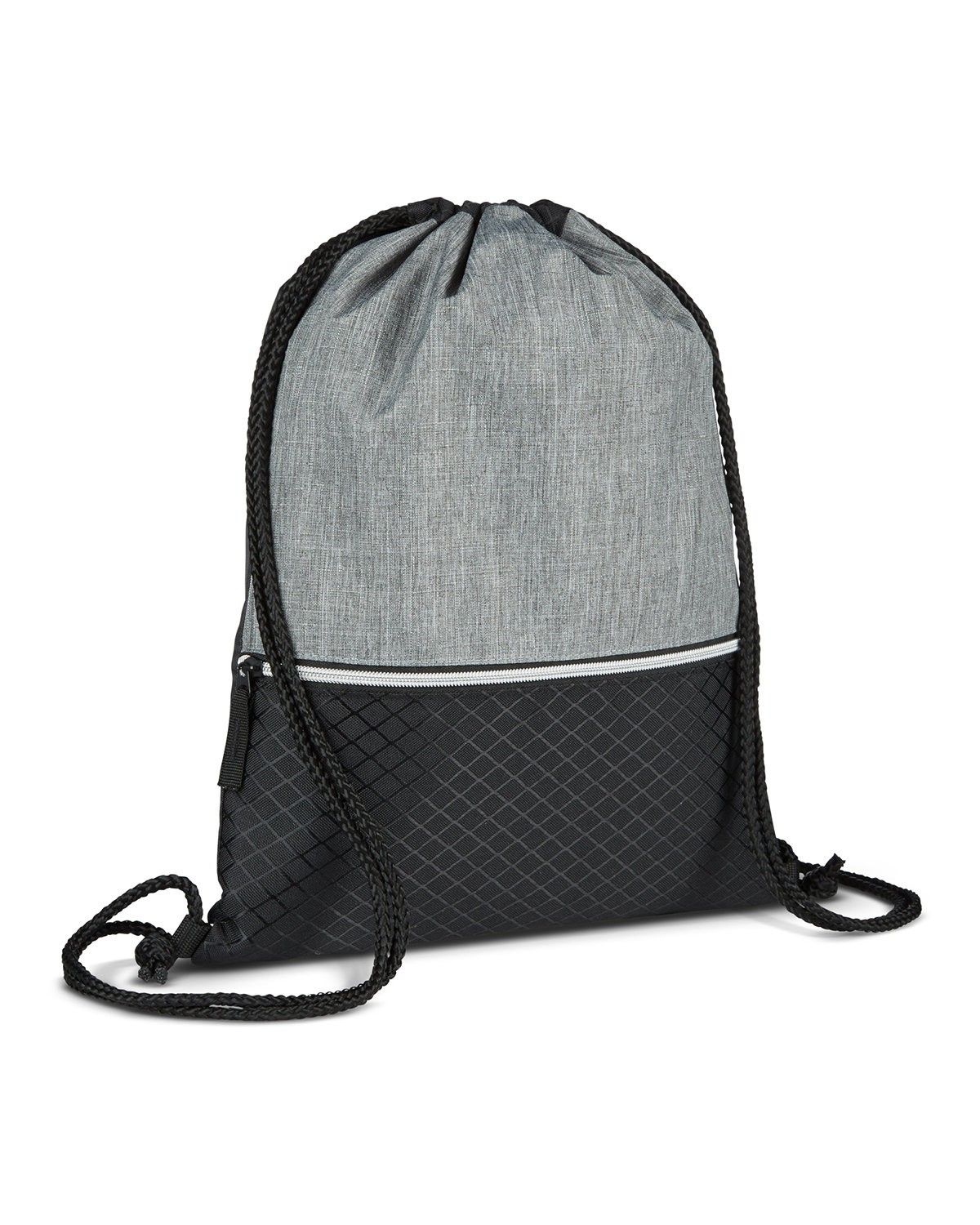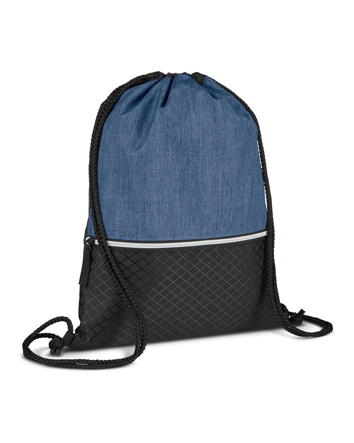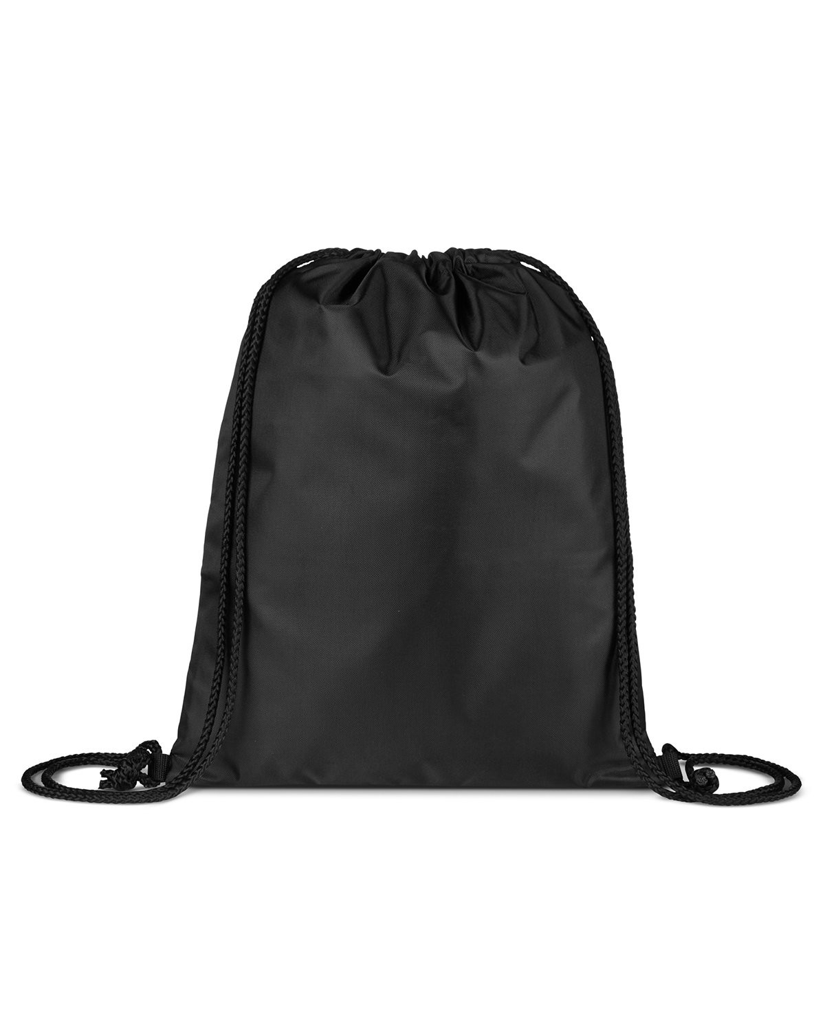 Drawstring bag made of of 300D Polyester with PU backing with 600D Polyester textured front pocket. Solid black 420D Polyester back and 210D Polyester lining. Front zipper pocket measures approx. 13.5″w x 6.5″h. To clean wipe with damp cloth. Recommended weight tolerance: 22 lbs. 13.5000″ W x 17.5000″ H
