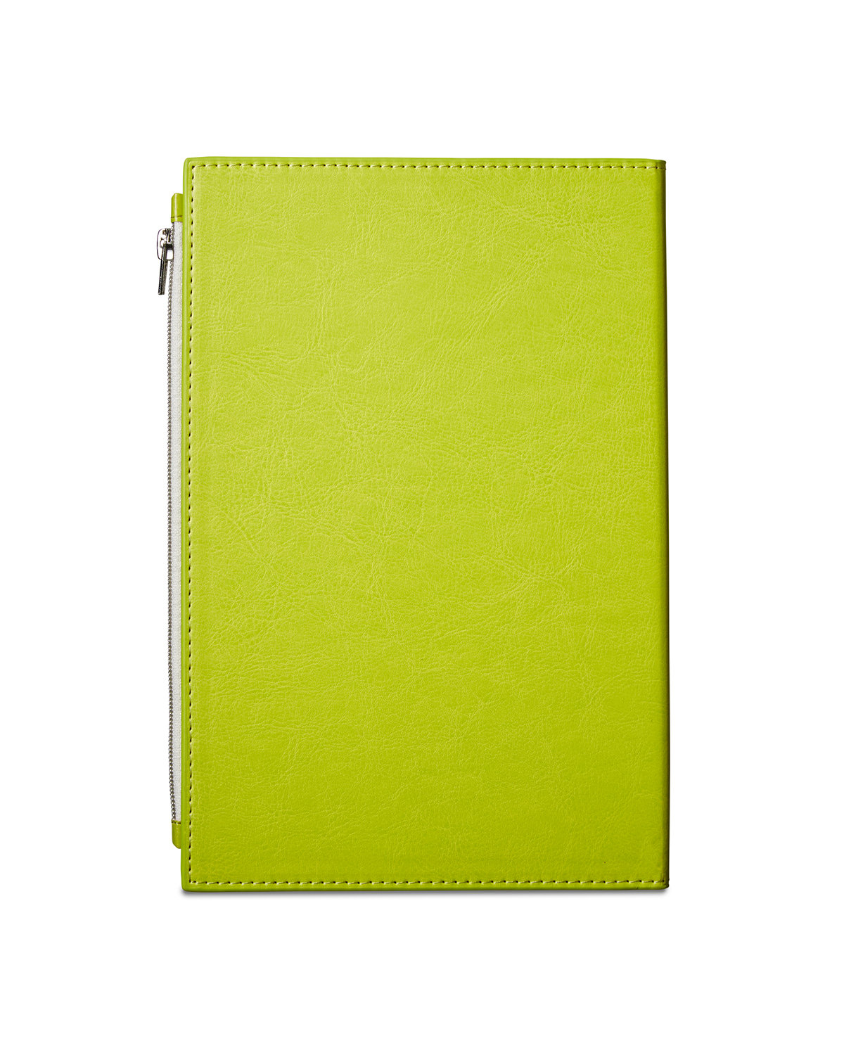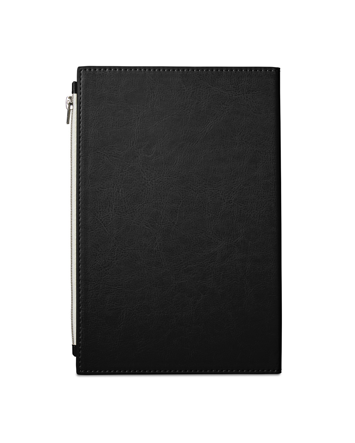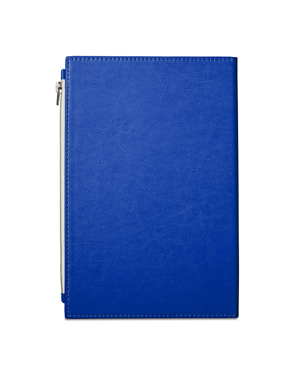 PU journal with integrated zipper pocket cover. Includes 80 lined sheets. Zipper pocket measures approx. 5.5″w x 8.26″h. Features stitched binding and matching ribbon bookmark. 5.7000″ W x 8.5000″ H x 0.5000″ D