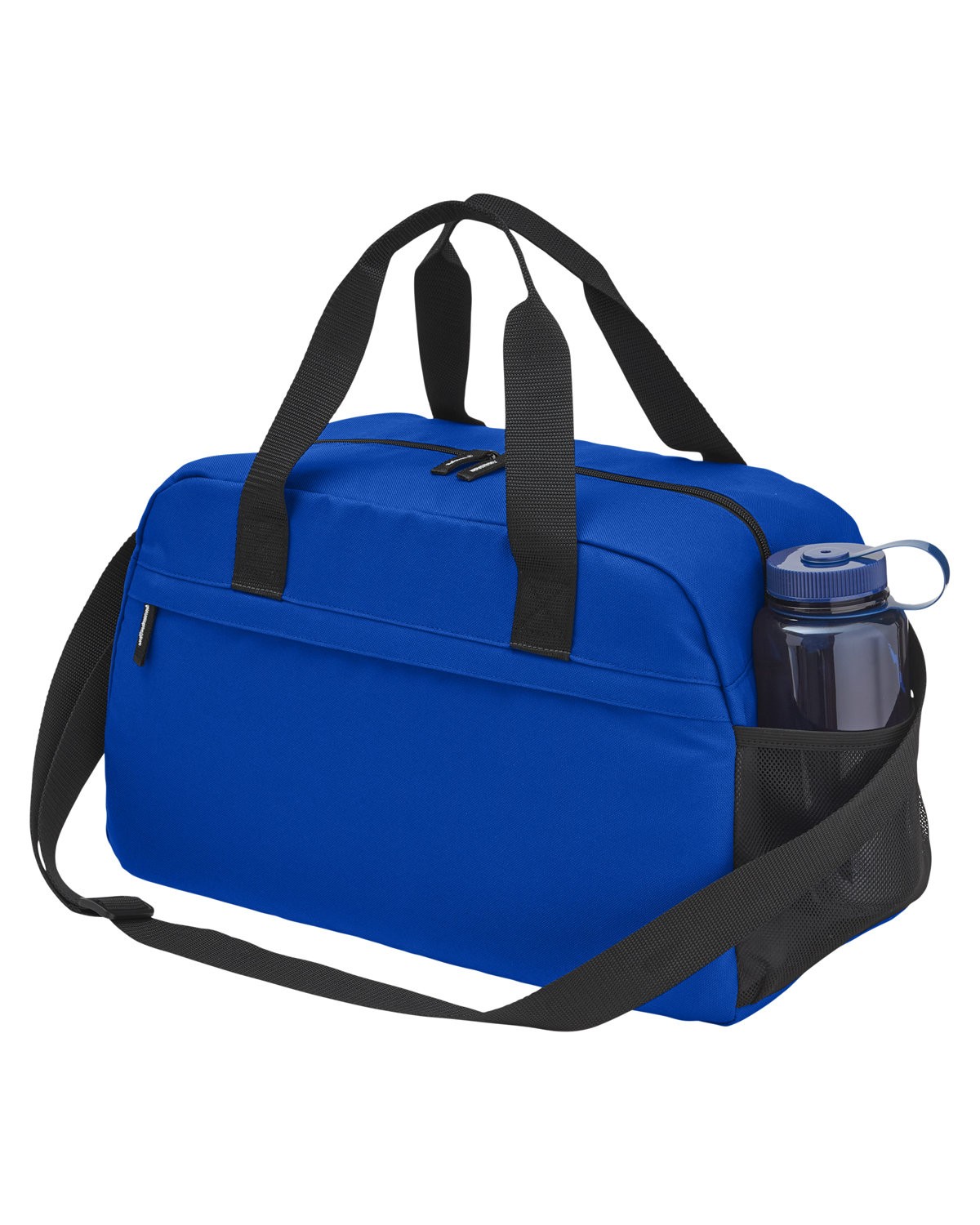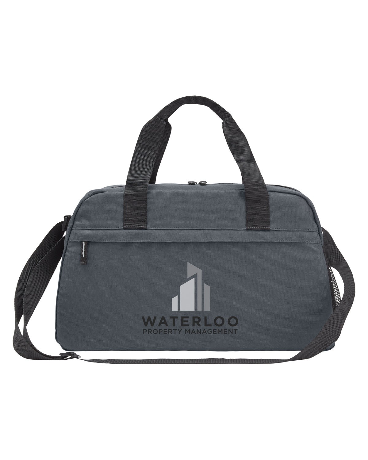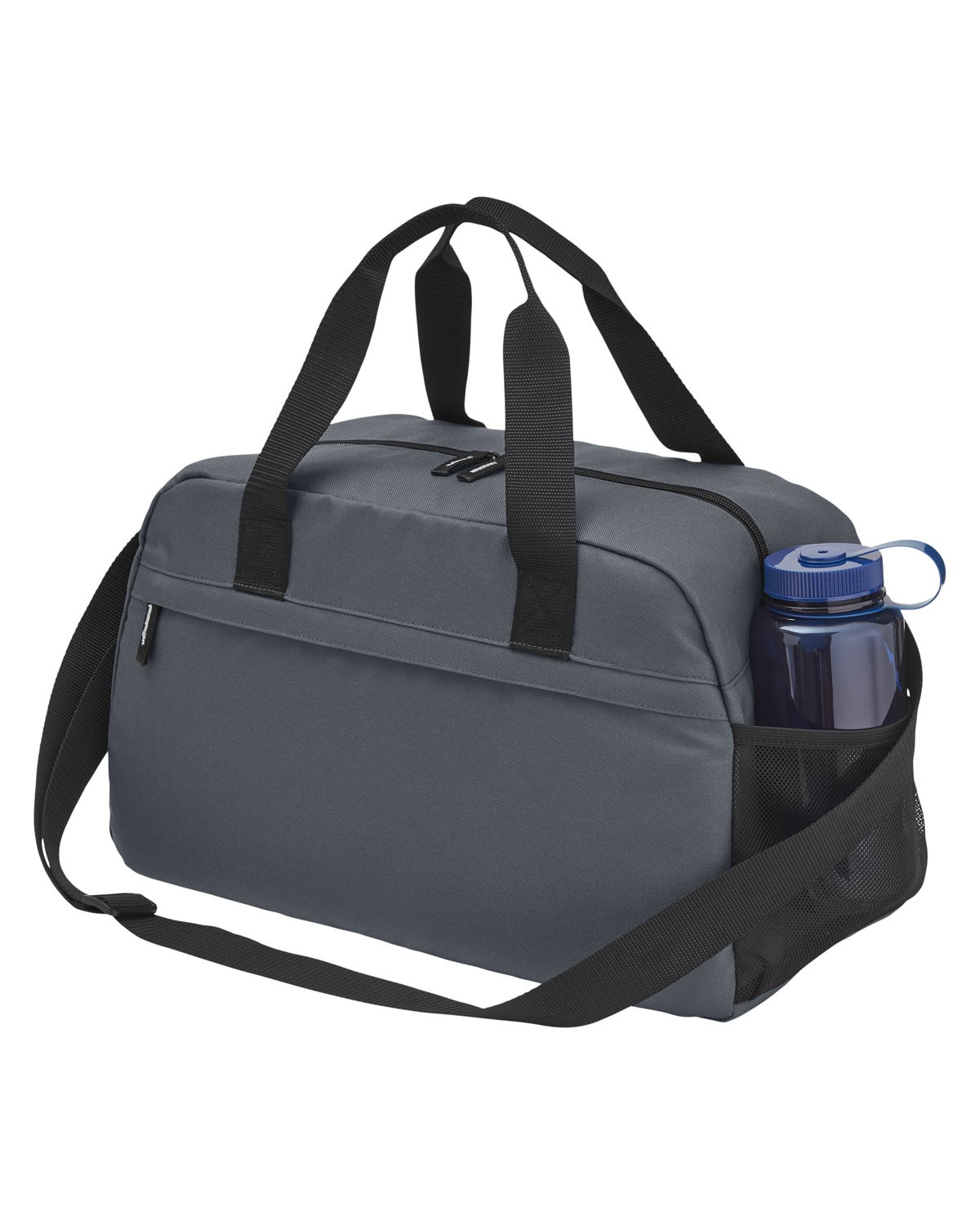 Weekender bag made of 600D Recycled Polyester. Whether you’re hitting the gym, going on a weekend trip or simply need a reliable bag for your daily commute, this duffel has you covered. Large main compartment, front zip pocket, side mesh bottle pocket, inside pocket to hold small valuables. Adjustable shoulder strap, carry handles with snap wrap. 50% of this item’s total composition is made from recycled materials, and the fabrics themself contains 100% post-consumer recycled content. Recommended weight tolerance: 22 lbs. 18.5000″ W x 11.0000″ H x 8.7000″ D
