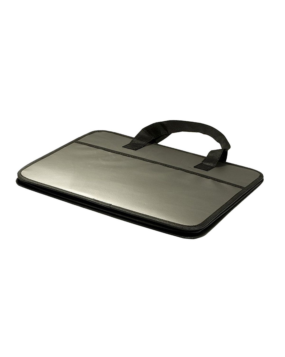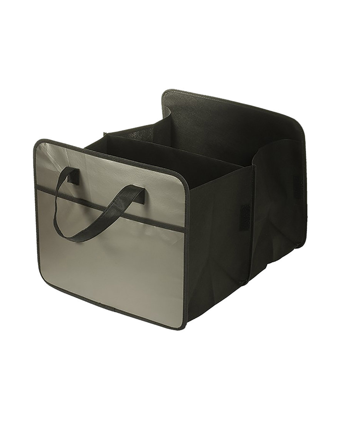 Reusable auto-organizer made from laminated 80 GSM Non-Woven Polypropylene. Folds flat but expands wide with cardboard reinforced center divider. Outer pockets on front and back. Hook and loop fastener adhesive closures along sides to reduce size to a single compartment tote. Recommended weight tolerance: 8.5 lbs. 14.2500″ W x 12.2500″ H x 17.5000″ D