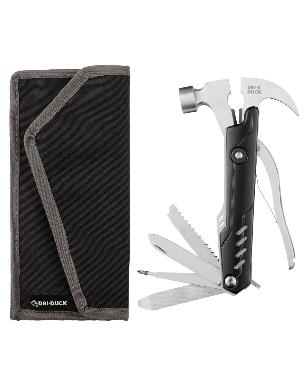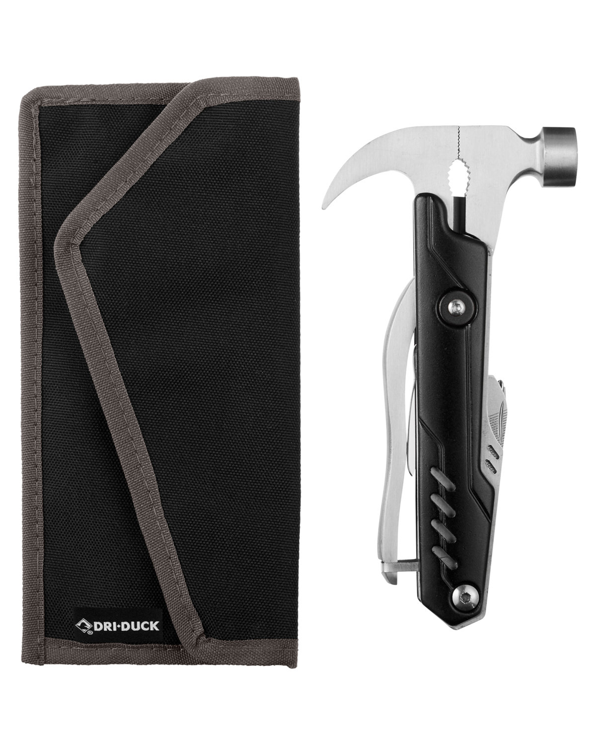 Stainless steel, 600D recycled polyester. This robust product has all the essential tools you need. 11 functions, including:. nail claw. hammer. two (2) pliers. wire cutter. knife. saw. nail file. bottle opener. two (2) screwdrivers. 3.5000″ W x 6.9000″ H x 0.8000″ D