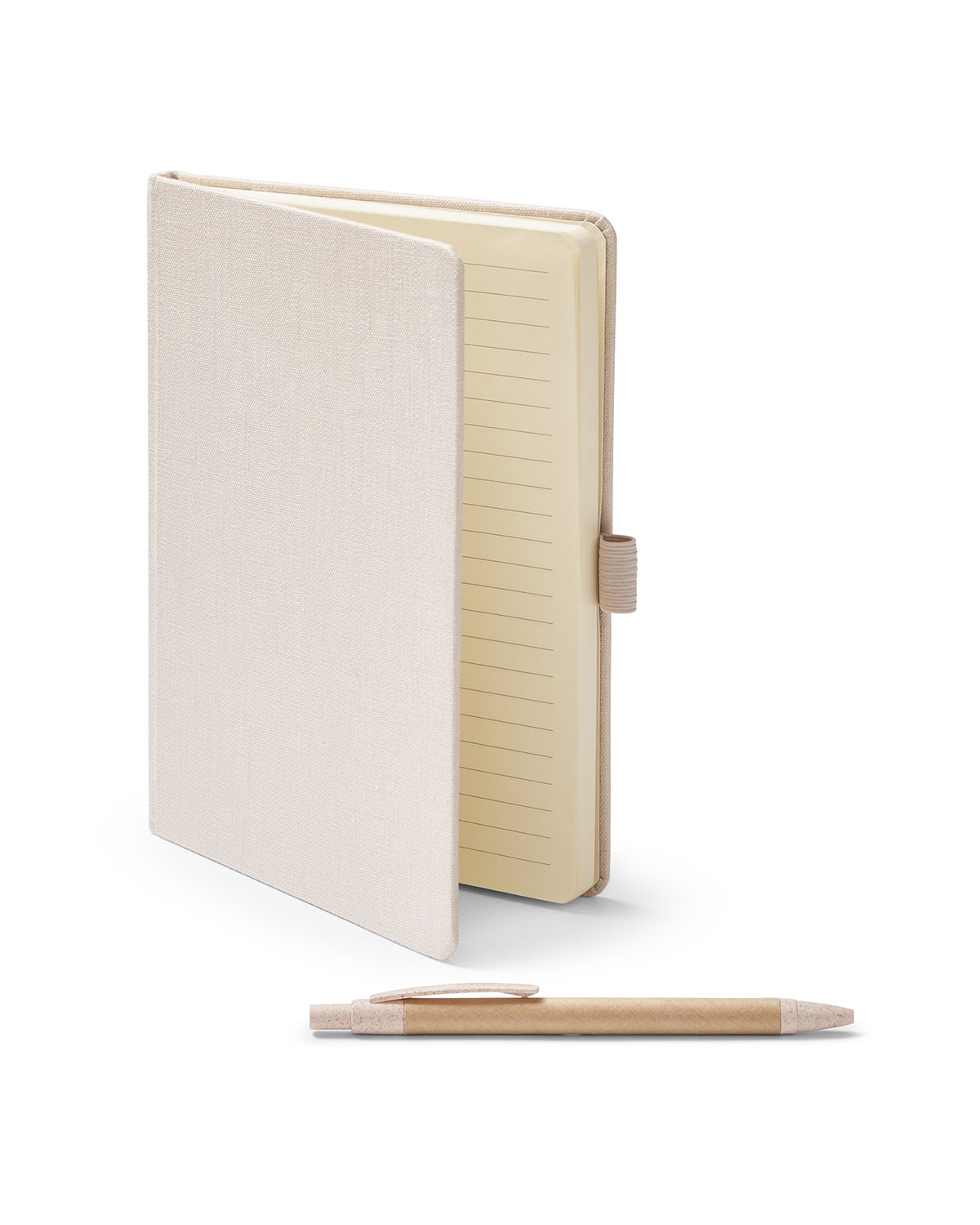 Journal & pen combo featuring a Hemp and Cardboard hard cover and matching retractable pen. Hemp is a fast-growing, renewable material. Includes 80 sheets wide-ruled beige 70 GSM paper. Matching elastic pen loop and elastic closure. Black ink pen with Kraft Paper barrel ABS + Wheat Straw accents. 6.0000″ W x 8.0125″ H x 0.5000″ D