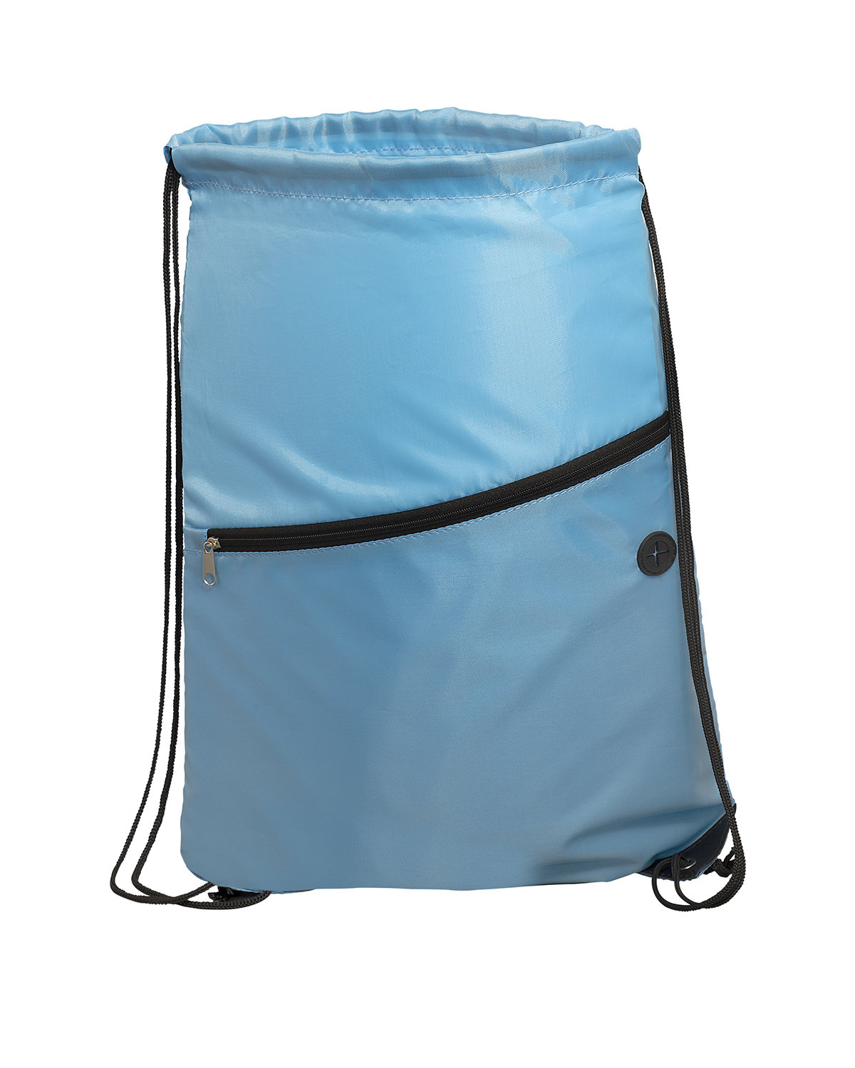 Cinch-up drawstring backpack made of 210D Polyester with PU backing featuring angled front pocket. Front zipper pocket measures approx. 12″ x 11″. Features Rubberized headphone port. Adjustable soft Nylon shoulder strap doubles as drawstring closure. Reinforced black grommeted corners. Recommended weight tolerance: 6.5 lbs. 12.6000″ W x 17.7000″ H