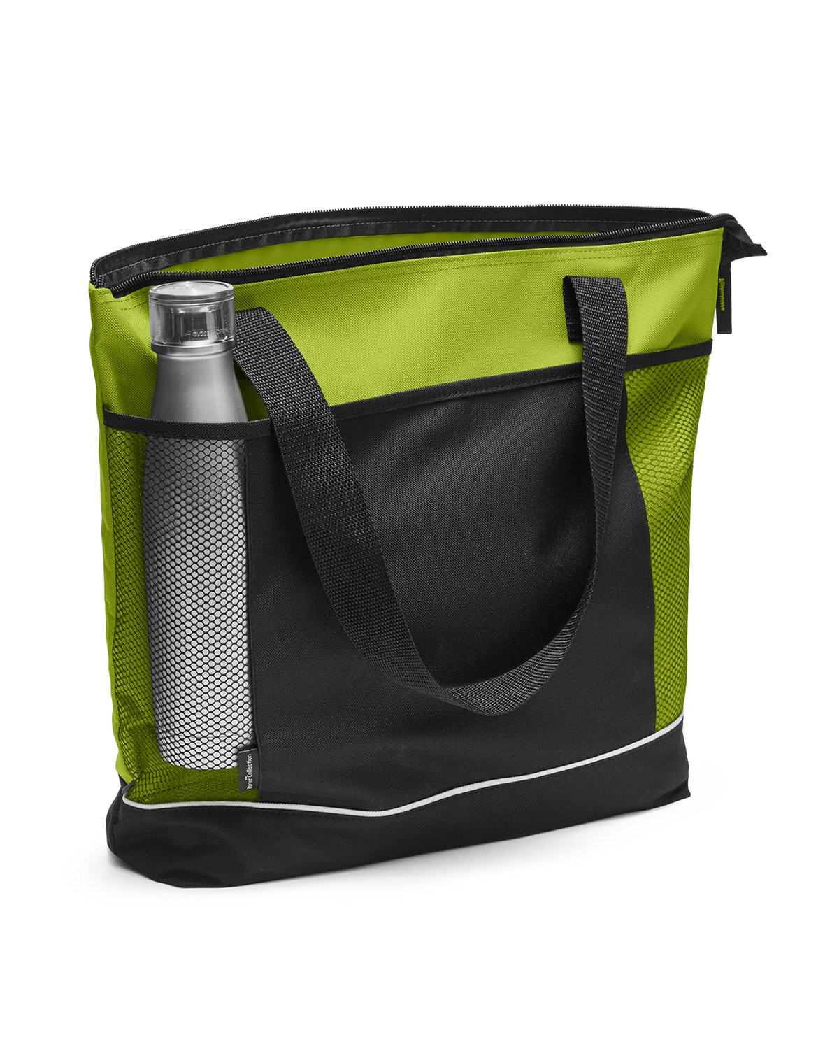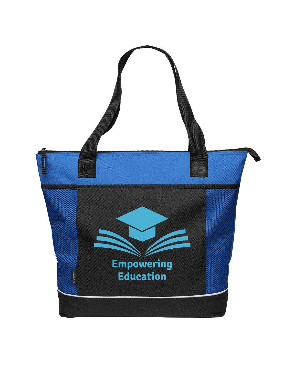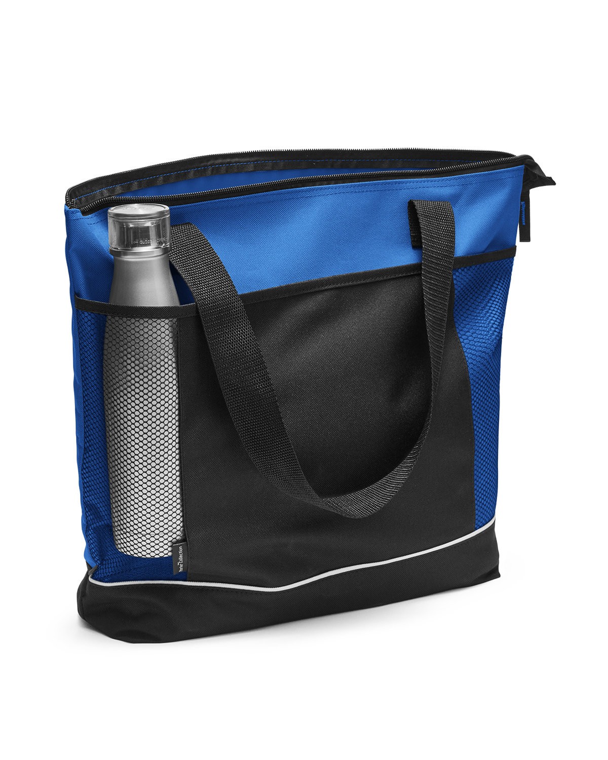 Jumbo tote bag made of 600D Polyester with PVC coating. Features large front open pocket with side mesh panels (approx. 17.65″w x 9.5″h). Gusset allows for fuller bag. Web carry handles measure approx. 23″l x 1.5″w. Hand wash only: wipe clean with damp cloth. Recommended weight tolerance: 22 lbs. 17.7500″ W x 15.0000″ H x 4.7500″ D