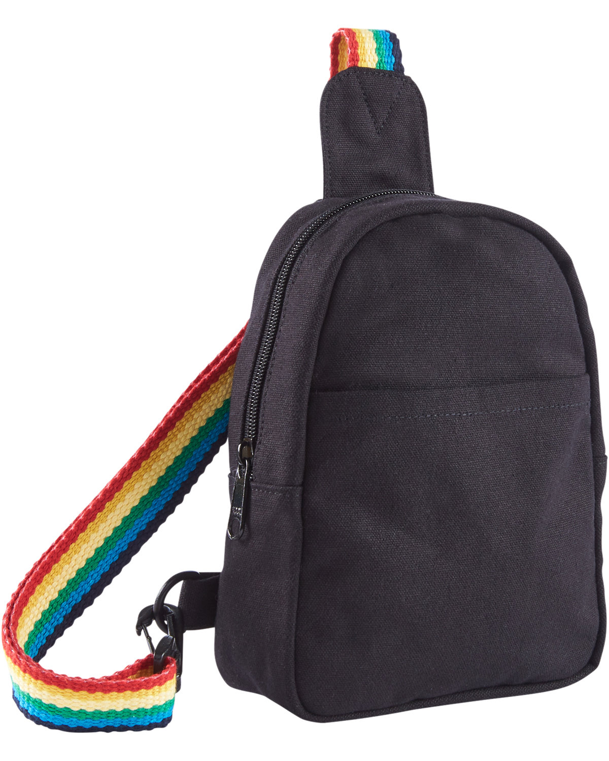 A compact, stylish Recycled 12 oz. Cotton crossbody bag with a playful colorful rainbow strap. Zippered main compartment with inner zippered pocket, inner slash pocket and a back zippered pocket. Strap is adjustable and can be altered to wear on your left shoulder or right (adjusts from approx. 16.5″L to 35″L). Spot clean only. Recommended weight tolerance: 11 lbs. 5.0000″ W x 7.5000″ H x 2.3000″ D