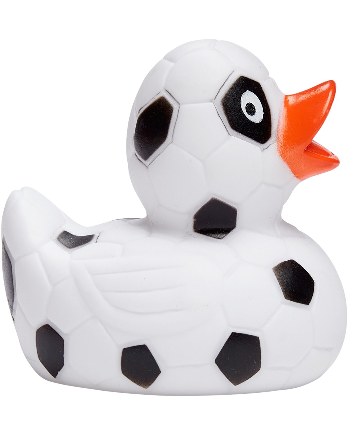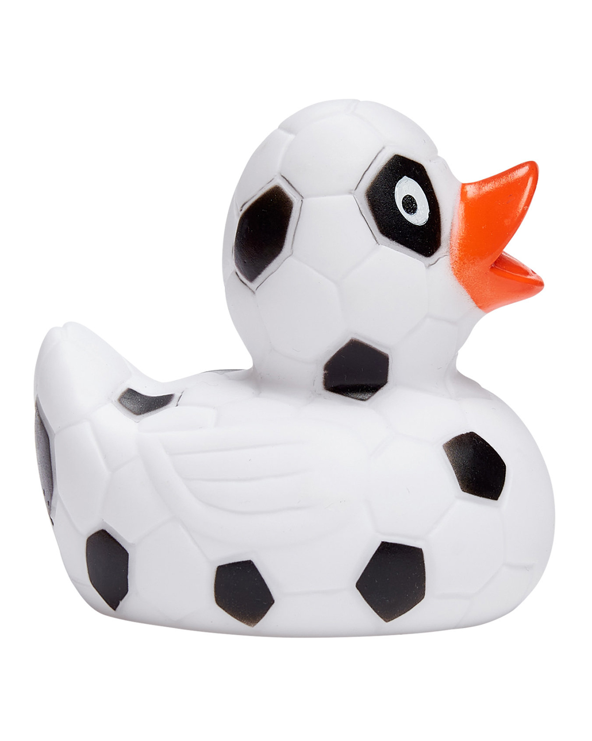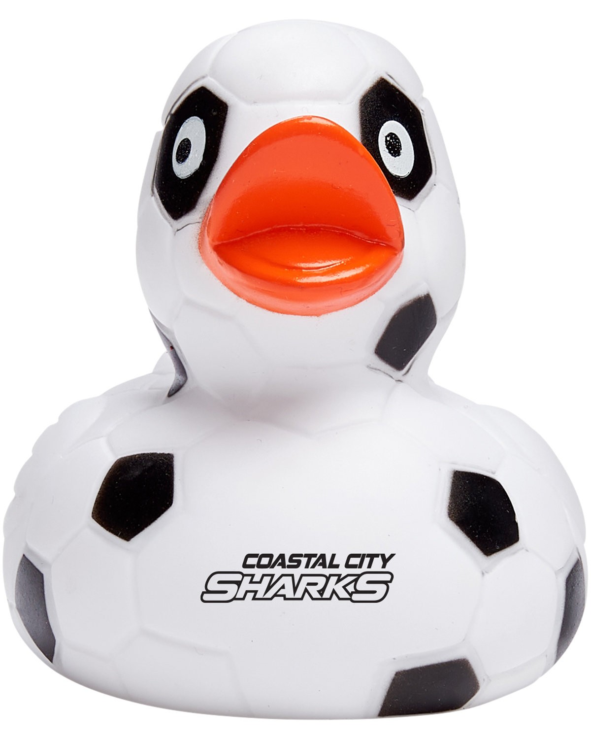 Unique promotional item for sports fans of all ages. Rubber duck with body designed to look like a soccer ball with white and black paneled body. Ducks are not weighted for racing or balanced floating. 3.0000″ W x 3.5000″ H x 4.0000″ D
