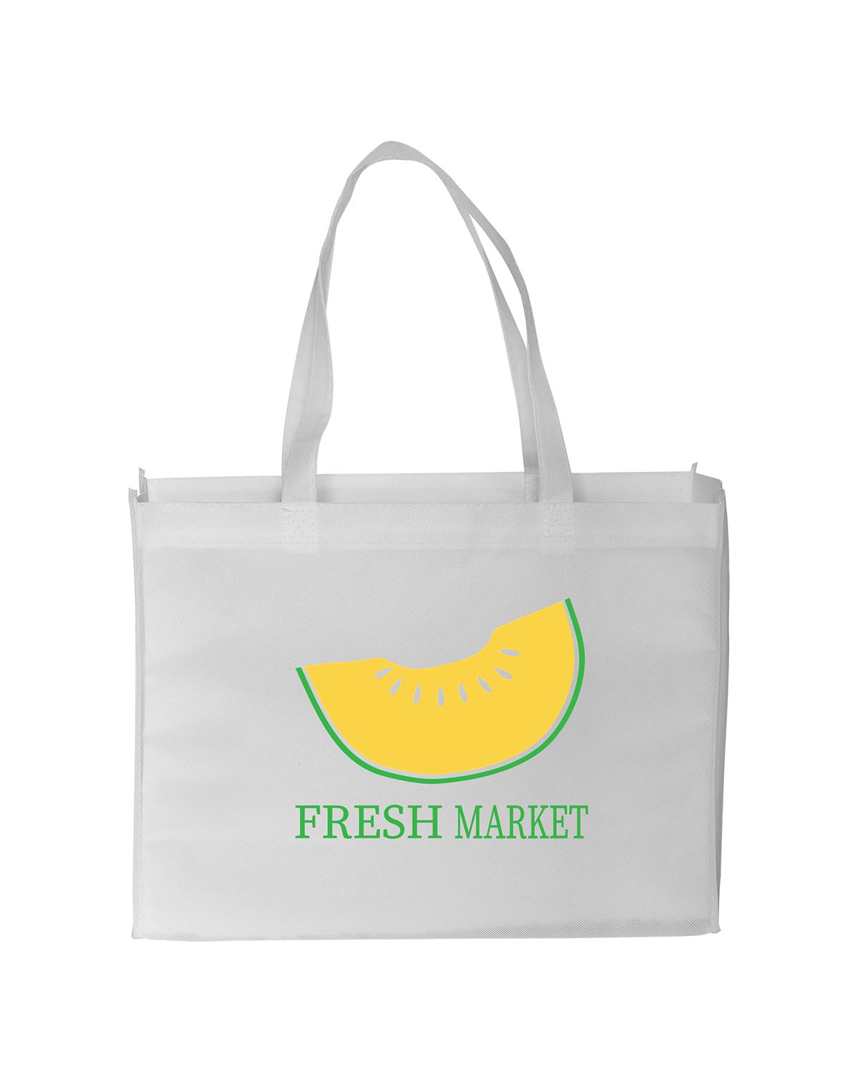 Reusable shopper tote made of durable 80 GSM Non-Woven Polypropylene. Spacious open tote with box gusset and crisp binding edge seams. Reinforced handles, 22″ in length. Recommended weight tolerance: 11 lbs. 16.0000″ W x 12.0000″ H x 6.0000″ D