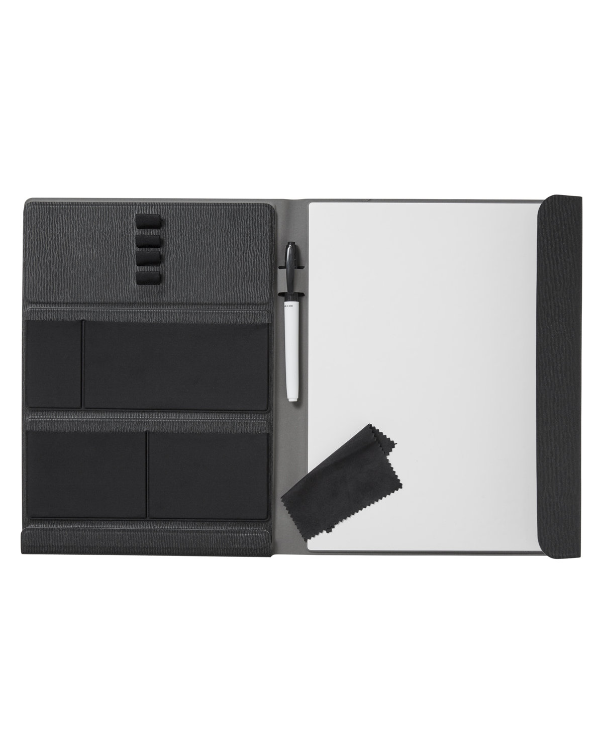 Save paper and the environment with the integrated PET whiteboard with black dry erase marker (wipe/cloth included). Inner magnetic sleeve with transforms into a triangle origami for versatile options: pen holder, expandable pockets for USB sticks, cables, business cards and more. Place triangle sleeve at inner base of front flap to create a mobile or tablet stand. 9.6000″ L x 12.3000″ W
